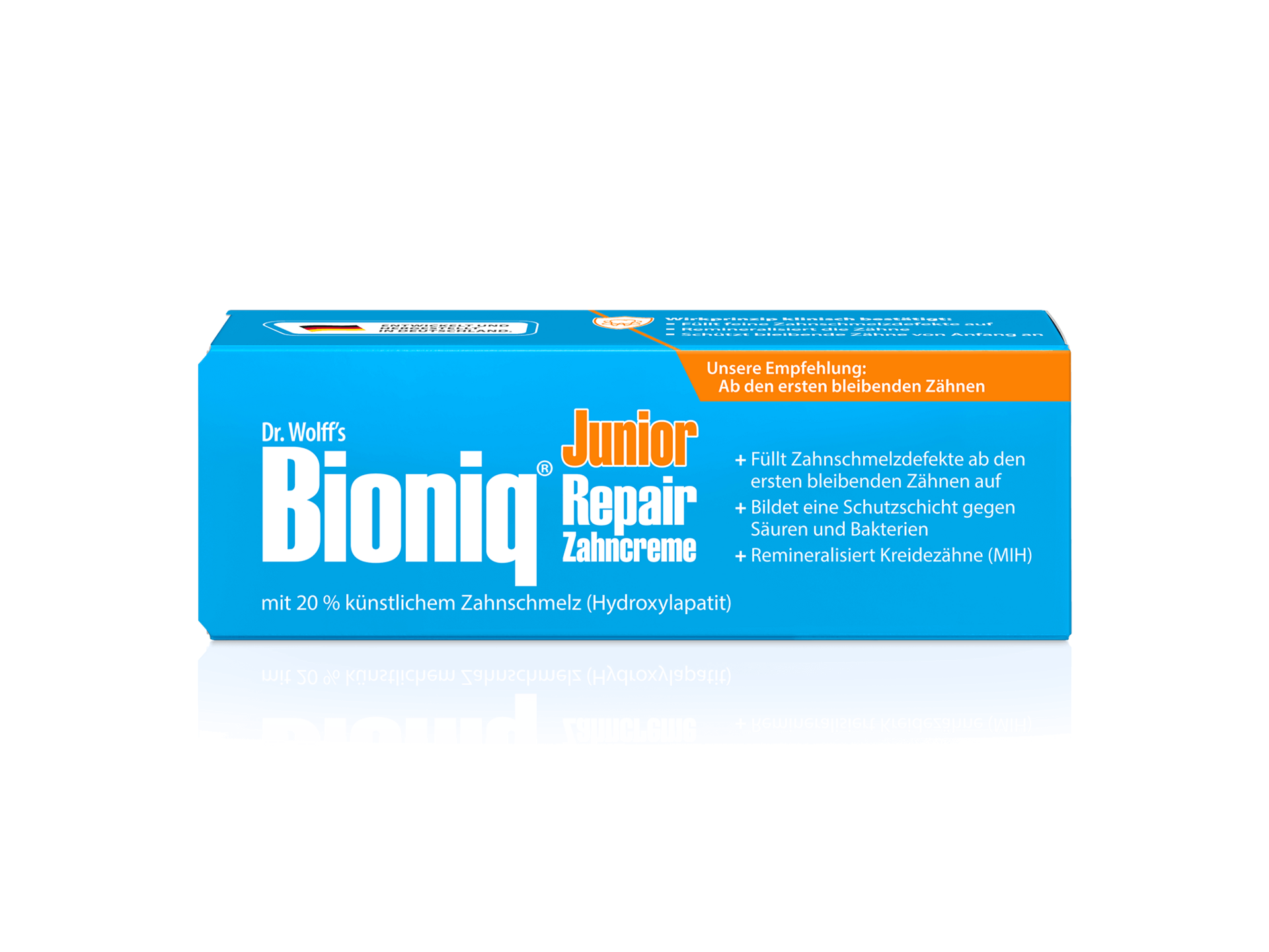 Mit dem Zahnwechsel sind die bleibenden Zähne sofort alltäglichen Belastungen wie Säuren, Zucker und Abnutzung ausgesetzt. Diese können die Zahnschmelzoberfläche schädigen und insbesondere bei Kreidezähnen (MIH) zu schmerzempfindlichen Zähnen führen. Bioniq® Junior enthält 20 % künstlichen Zahnschmelz (Hydroxylapatit), der sich mit der Zahnschmelzoberfläche verbindet. Die Zähne werden bis in tiefe Schichten remineralisiert und mikrofeine Defekte repariert.